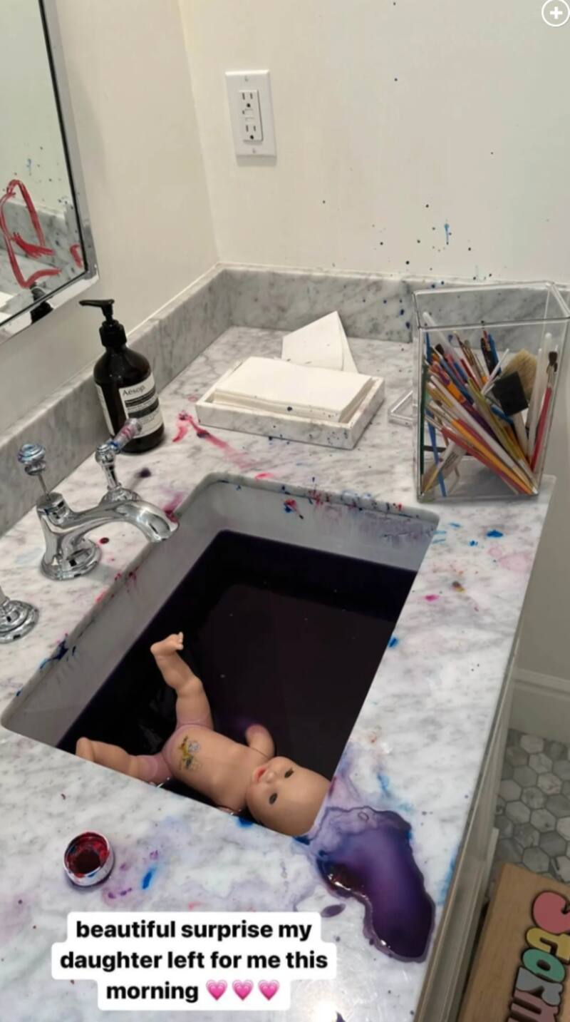 Kylie Jenner recurrió a una historia de Instagram para mostrar la pintura de su hija de cuatro años, que usó como lienzo su baño de mármol y dejó todo el lavabo tapado y lleno de pintura.