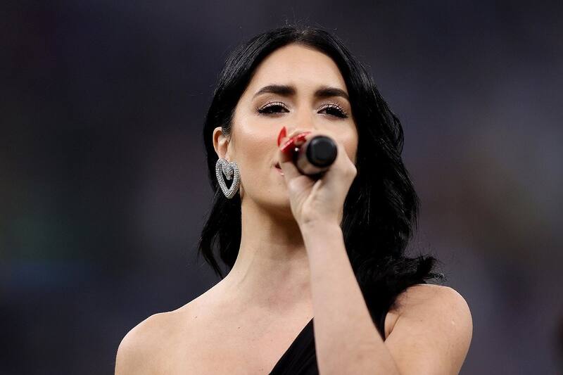 La protagonista de “Sky Rojo” fue una de las personalidades más esperadas de la tarde en Qatar, pues fue la responsable de entonar el himno de su país luciendo un precioso vestido negro de corte asimétrico.
