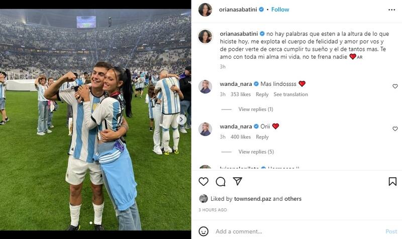 En el grupo de mujeres de los futbolista argentinos también destaca Oriana Sabatini, la novia de Paulo Dybala. La cantante subió a su cuenta de Instagram una foto de ambos celebrando el campeonato y escribió: "No hay palabras que estén a la altura de lo que hiciste hoy, me explota el cuerpo de felicidad y amor por vos y de poder verte de cerca cumplir tu sueño y el de tantos más. Te amo con toda mi alma mi vida, no te frena nadie".