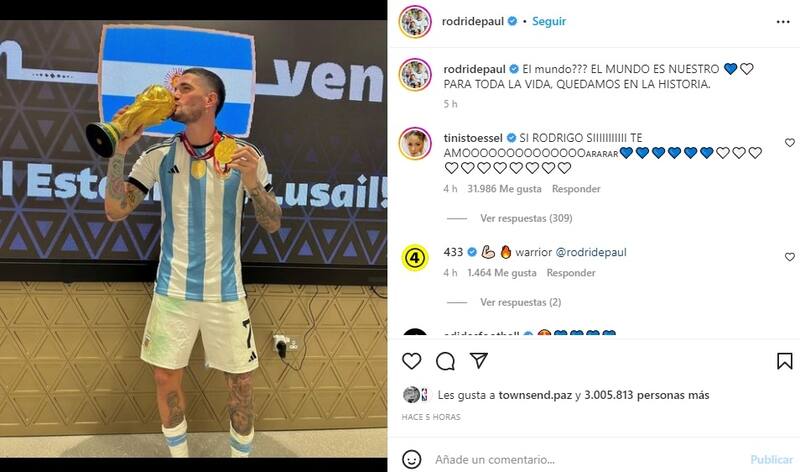 Rodrigo de Paul agregó: "Cuando arranco esta locura, te dije que no te iba a fallar, que me iba a quedar hasta el último día, y acá estamos cumpliendo la palabra... en poco te abrazo, espéreme un poquito más… GRACIAS. Te amoooo".
