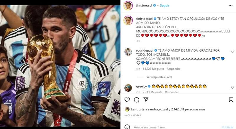 Pero usó su cuenta de Instagram para compartir su orgullo por el logró de Rodrigo de Paul, uno de los jugadores clave en la Copa del Mundo para Argentina. "TE AMO ESTOY TAN ORGULLOSA DE VOS Y TE ADMIRO TANTO. ARGENTINA CAMPEÓN DEL MUNDOOOOOOOOOOOOOOOOOOOOOO", escribió la cantante.