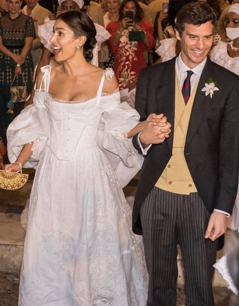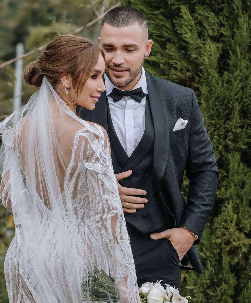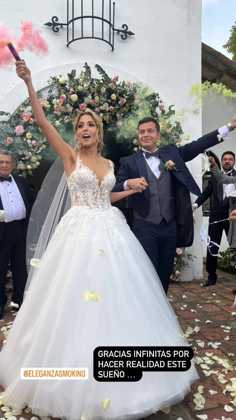 Después de estar dos años en una relación la presentadora lució un vestido estilo sirena, ajustado al cuerpo, mientras que el actor llevó un traje de color azul claro. "Un día mágico que marcó el inicio de una nueva etapa en nuestra historia de amor", señaló el actor respecto a su día especial.