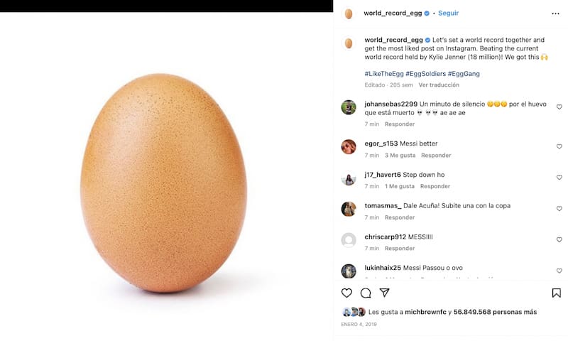 La publicación de Messi supera ahora la publicación reina que batió récords, en manos de una simple imagen de un huevo. Sí, un huevo que actualmente cuenta con más de 56 millones de me gusta.