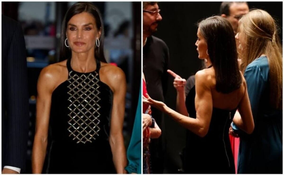 Esta vez, la monarca de España volvió a impactar con un impresionante vestido oscuro con un pronunciado escote que dejó su espalda y brazos musculosos al descubierto. La royal eligió un vestido de la colección de Teresa Helbig para Otoño/Invierno 2022-2023 en color negro y corte midi con escote halter con adornos de cristales en la parte delantera.