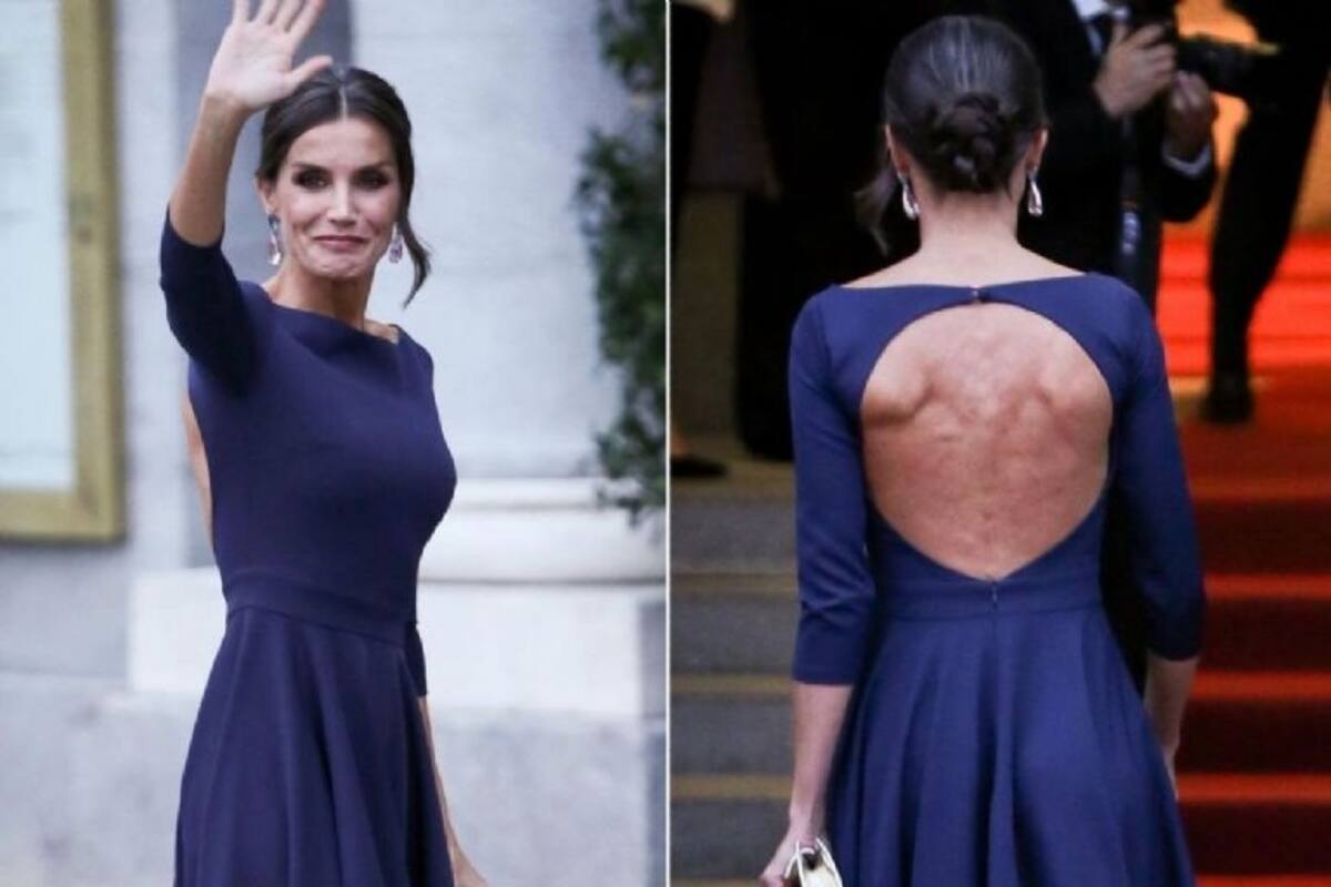 La reina Letizia no dejó de ser noticia por sus bien elegidos outfits. Durante la inauguración de la nueva temporada del Teatro Real de Madrid impactó con un vestido azul de la marca española Miphai. Se trata de un diseño midi en azul marino y realizado en crepé. Con manga francesa, escote delantero cerrado y falda con vuelo, lo que causó sensación en medios españoles e internacionales fue el impactante escote posterior que dejó ver su bien tonificada espalda.