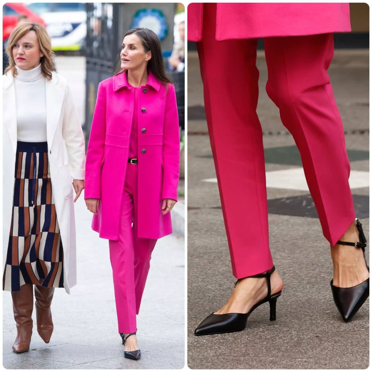 En esta ocasión eligió un pantalón de vestir de Hugo Boss, a juego con una blusa con cuello redondo, ambos en un intenso fucsia, que acompañó con un abrigo en el mismo tono de la misma marca y para hacer juego con los grandes y llamativos botones de su abrigo, Letizia complementó con cinturón.