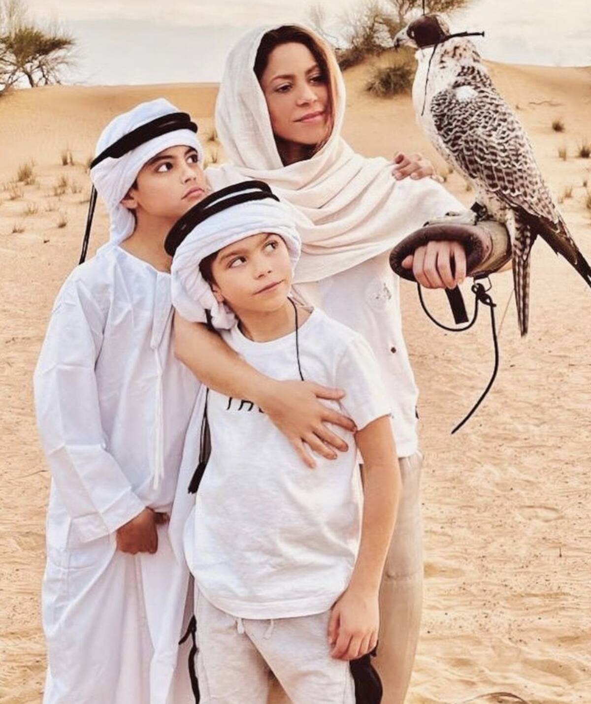 "En el desierto buscando la serenidad en esta navidad", escribió la artista colombiana junto a sus hijos Sasha y Milan mientras posan en Dubái con un halcón en la mano, mientras todos visten de blanco.