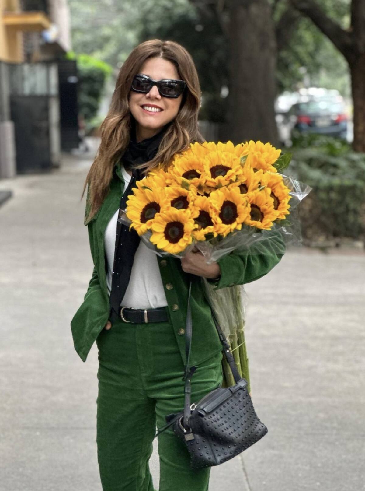 La reconocida actriz se vio caminando por las calles de México con un ramo de flores de color amarillo. Sonriendo y vestida de verde se le ve feliz al celebrar las fiestas.