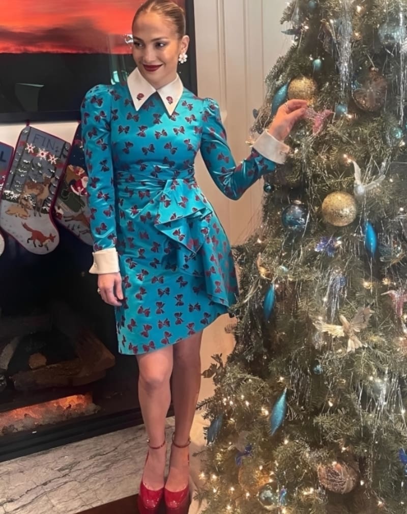 En la misma publicación, la actriz lució con un minivestido en color turquesa estampado con moños rojos, que resaltó su figura. Su look lo completó con zapatos cerrados rojos de plataforma y pulsera. Ella se tomó la foto junto al árbol navideño de su hogar y dejó ver su atuendo de forma completa.