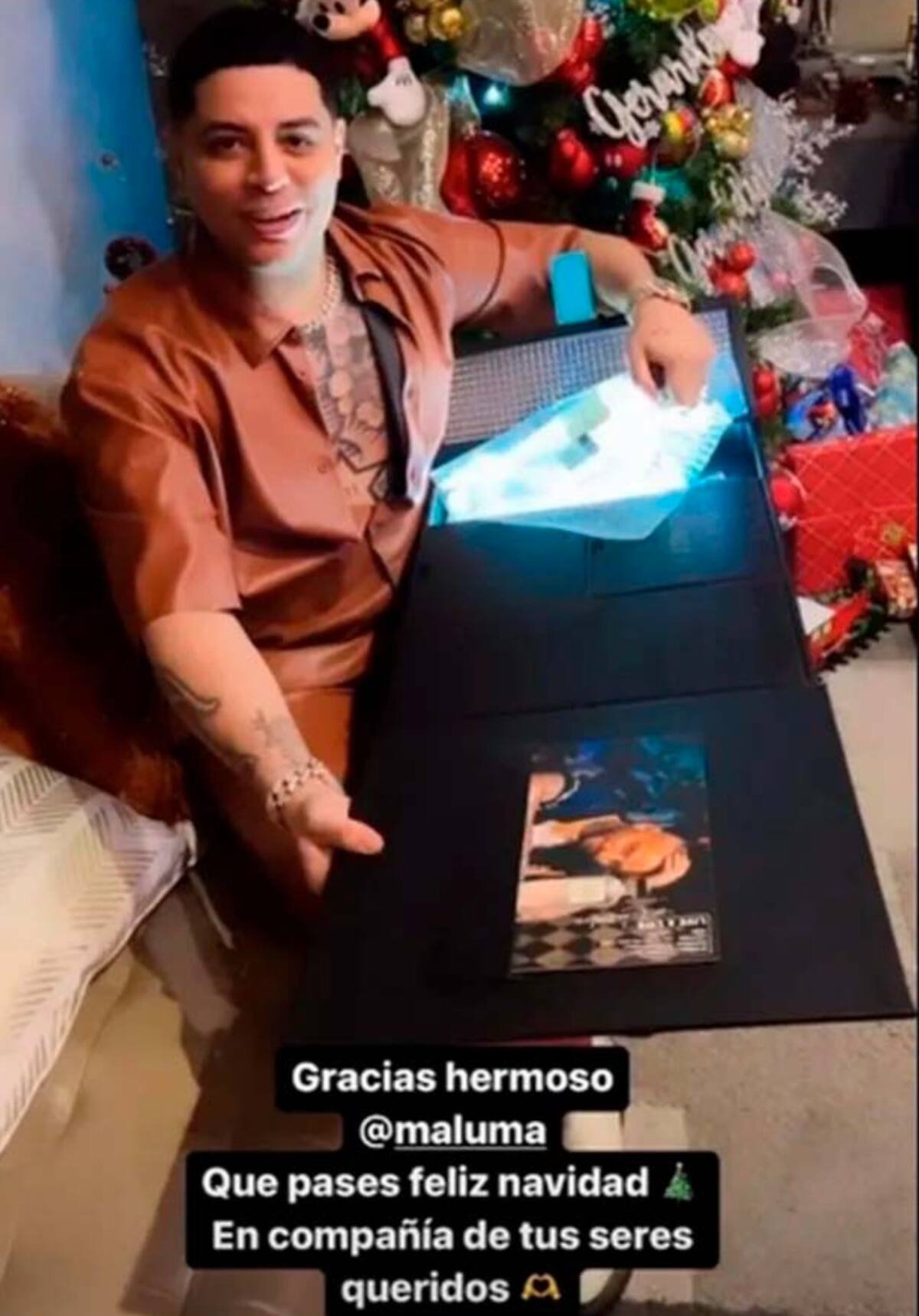“Gracias hermoso Maluma. Que pases feliz navidad en compañía de tus seres queridos”, escribió Caz junto a una caja con la foto del cantante de donde sacó la botella de su propia marca de mezcal “Contraluz”.