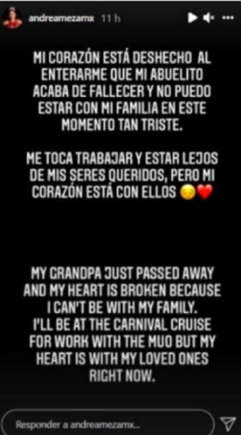 "Mi corazón está deshecho al enterarme que mi abuelito acaba de fallecer y no puedo estar con mi familia en este momento tan triste. Me toca trabajar y estar lejos de mis seres queridos, pero mi corazón está con ellos", dijo en ese entonces a través de una historia en sus redes sociales.