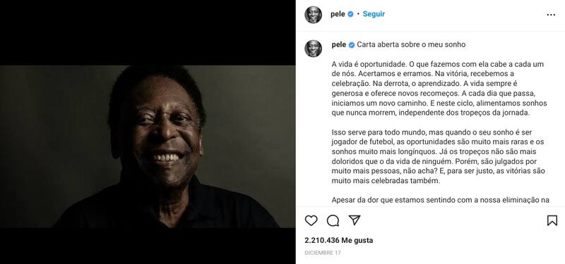 A propósito de la eliminación de la selección de Brasil en el Mundial de Qatar, se publicó una carta en la cuenta oficial de Pelé atribuida al mismísimo "Rey", quien falleció este 29 de diciembre. En ella reflexionaba acerca de la vida y los sueños, los triunfos y las derrotas, el éxito y el fracaso y, obviamente, el amor por el futbol y lo que ello conlleva.