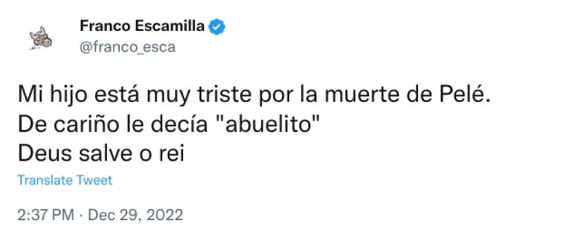 El comediante y standupero Franco Escamilla comentó la muerte de Pelé a través de su cuenta de Twitter. Sin embargo, haciendo eco de su descripción de "amo del sarcasmo", le puso humor a su posteo.