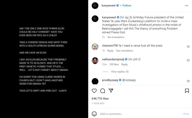 Una decisión que terminó por enfrentar al rapero contra el millonario y que este domingo sumó un nuevo episodio, luego de que el ex de Kim Kardashian subiera a su cuenta de Instagram un mensaje planteando que Elon Musk es mitad chino. "¿Soy el único que piensa que Elon podría ser mitad chino? ¿Han visto sus fotos cuando chico?", escribió.