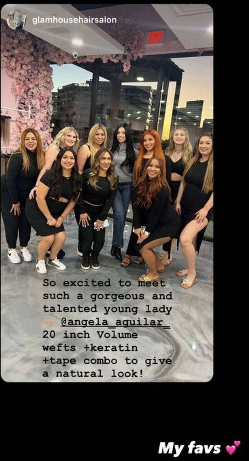 Asimismo, la cantante compartió otra historia en sus redes en las que agradeció a Glam House Hair Salon por haberle creado su nuevo look y posó con las empleadas del salón de belleza. "Muy emocionada de conocer a una joven tan hermosa y talentosa. 50 centímetros de extensiones y queratina para dar un aspecto natural", escribió la cuenta del salón de belleza al que acudió Ángela Aguilar.