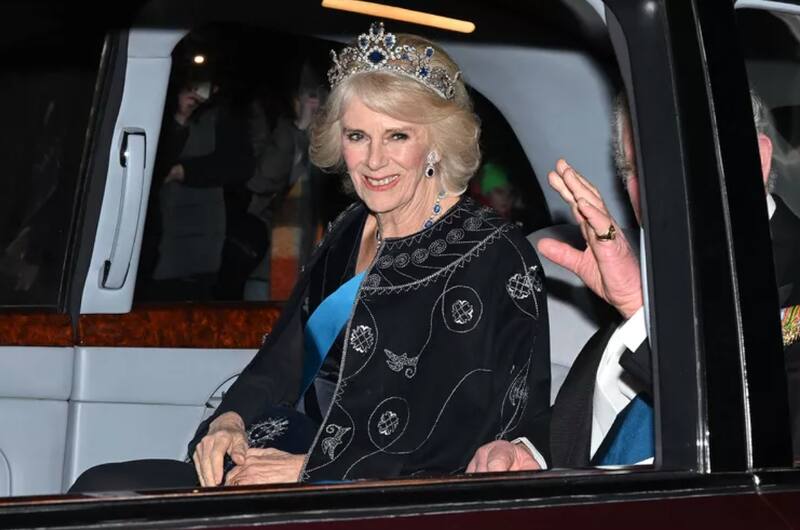 Esta vez la reina consorte Camilla fue captada en camino a una recepción para el Cuerpo Diplomático en el Palacio de Buckingham, la noche de este martes. La esposa del rey Carlos III brilló con la tiara de zafiros belgas y un vestido negro de Anna Valentine.
