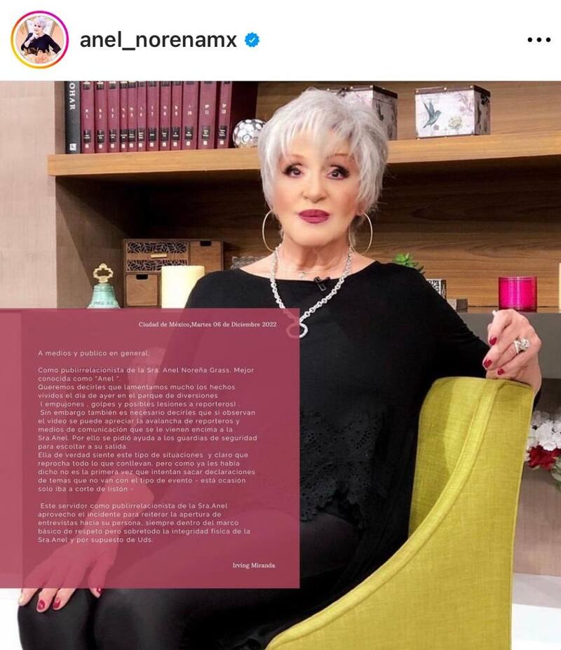 Fue tal el alboroto que se desató entre Anel Noreña, la prensa y la gente de seguridad, a quienes acusan de golpear a algunos integrantes de los medios de comunicación, que la heredera del "Príncipe de la Canción" envió un mensaje por medio de su cuenta de Instagram.