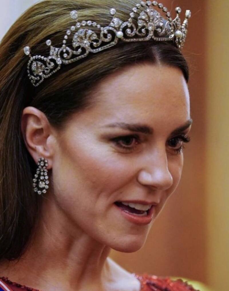 Esta es la cuarta vez que usa ese tocado en particular; lo usó por última vez en 2015 para un banquete estatal en honor al presidente de China, Xi Jinping, El accesorio fue creado por la reina madre con un collar que su esposo, Jorge VI, le regaló para su boda en 1923.