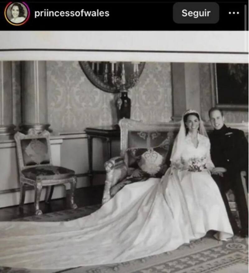 En la inédita foto se observa a la pareja sentada en un sillón mientras se toma de la mano. El impresionante largo del vestido de la princesa de Gales es el enfoque principal, mientras ellos sonríen felices.