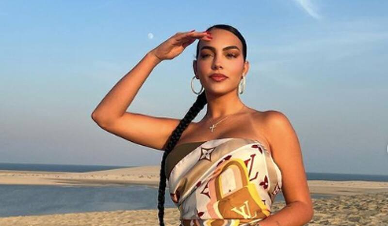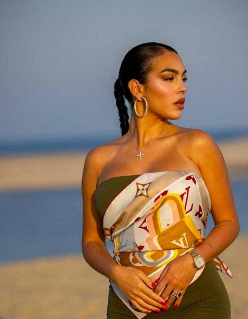 Georgina Rodríguez lució fenomenal en el desierto con un vestido ceñido al cuerpo color verde botella, uno de sus tonos favoritos de los últimos meses. Llevó un accesorio que llamó mucho la atención, una pañoleta perfectamente bien acomodada desde el pecho hasta la cintura para darle un toque diferente a la pieza sencilla y clásica.