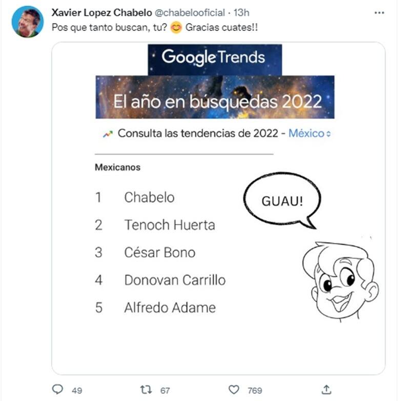 Estamos por terminar el 2022 por lo que algunas de las plataformas de contenido y búsqueda han revelado sus top 10 de lo más consumido y buscado durante el año y Xavier López "Chabelo" se convirtió en la persona mexicana más buscada en Google, por lo que no tardó en reaccionar.