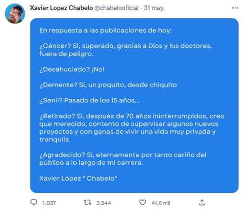 Dicho hecho hizo que el exconductor de "En Familia con Chabelo" reapareciera en Twitter, después de seis meses, cuando aclaró su estado de salud.