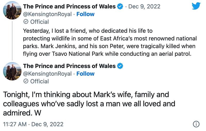 "Ayer perdí a un amigo que dedicó su vida a proteger la vida silvestre en algunos de los parques nacionales más famosos del este de África", comenzó el príncipe William en su publicación. "Mark Jenkins y su hijo Peter murieron trágicamente cuando sobrevolaban el Parque Nacional Tsavo mientras realizaban un patrullaje aéreo", siguió.