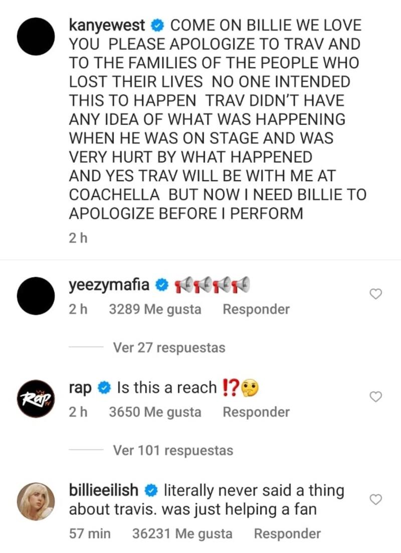 Fue esta frase la que algunos medios plantearon que Billie Eilish había hecho referencia a Travis Scott y al tragedia de Astroworld, lo que llevó a Kanye West a reaccionar. Ye compartió una publicación en al que se abordaba el tema y realizó una particular amenaza.