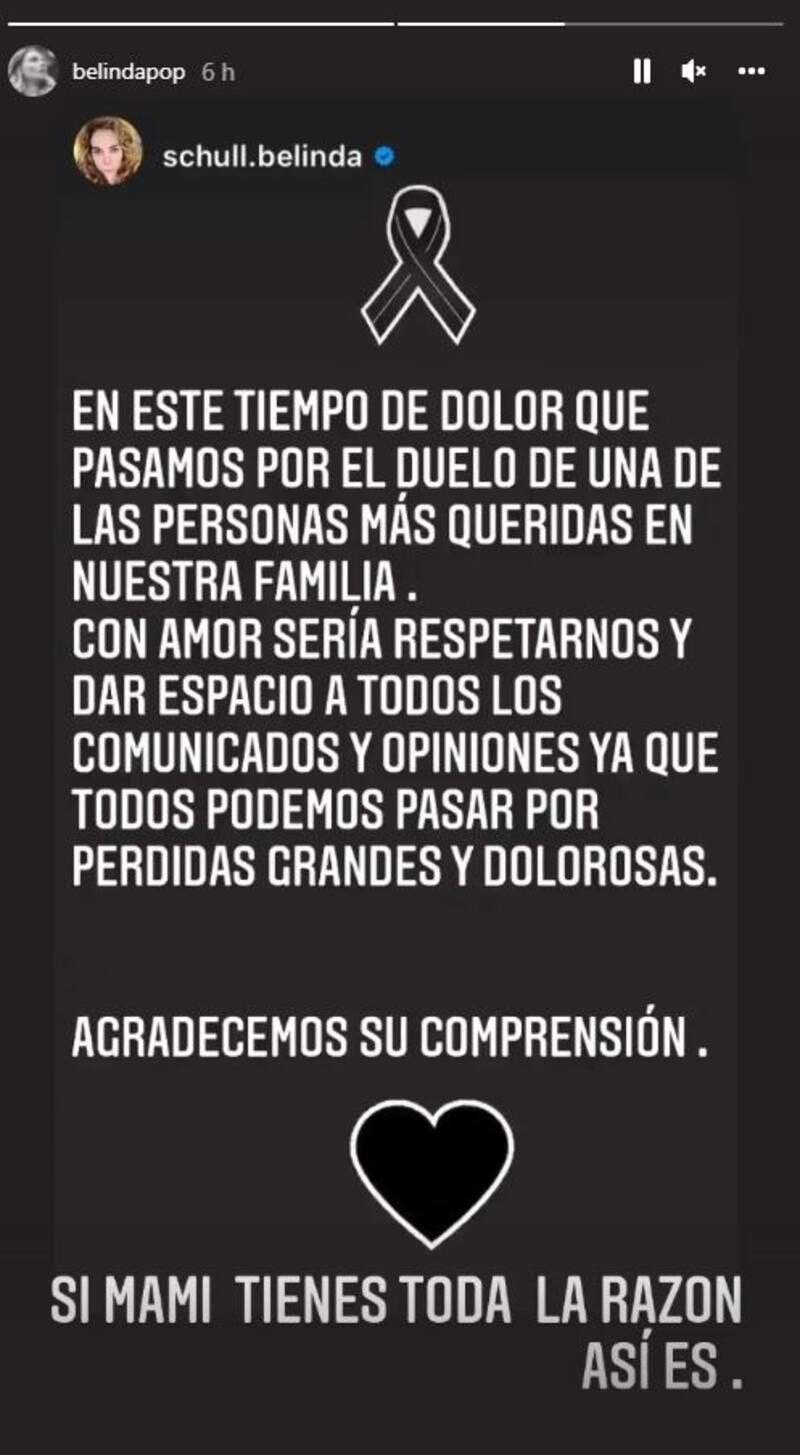 "En este tiempo de dolor que pasamos por el duelo de una de las personas más queridas en nuestra familia, con amor sería respetarnos y dar espacio a todos los comunicados y opiniones ya que todos podemos pasar por pérdidas grandes y dolorosas. Agradecemos su comprensión", publicó.