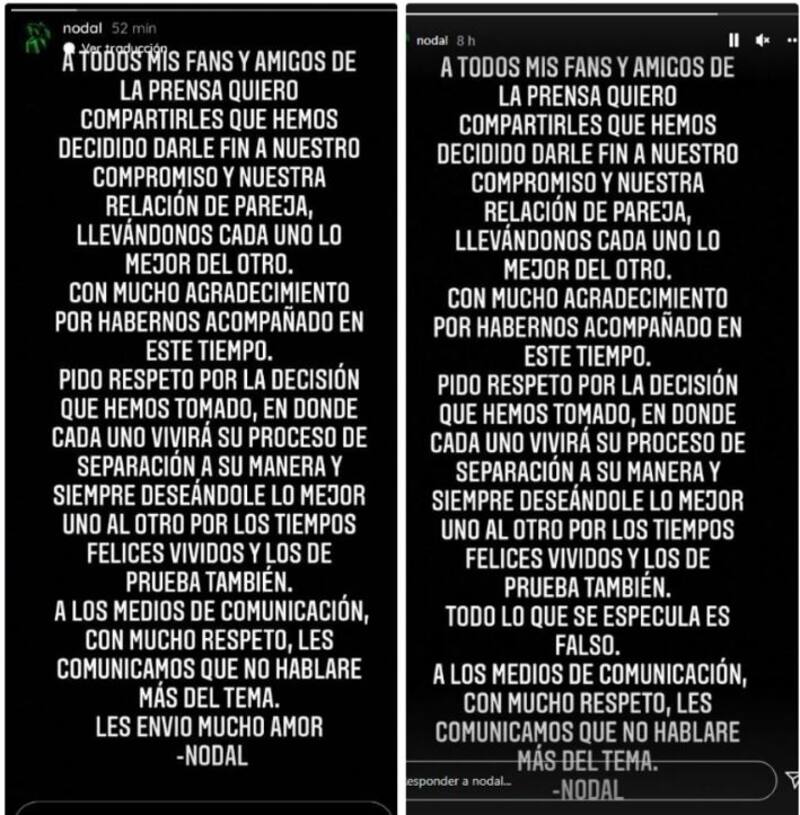 "A todos mis fans y amigos de la prensa quiero compartirles que hemos decidido darle fin a nuestro compromiso y nuestra relación de pareja, llevándonos cada uno lo mejor del otro. Con mucho agradecimiento por habernos acompañado en este tiempo", escribió al inicio de la publicación.
