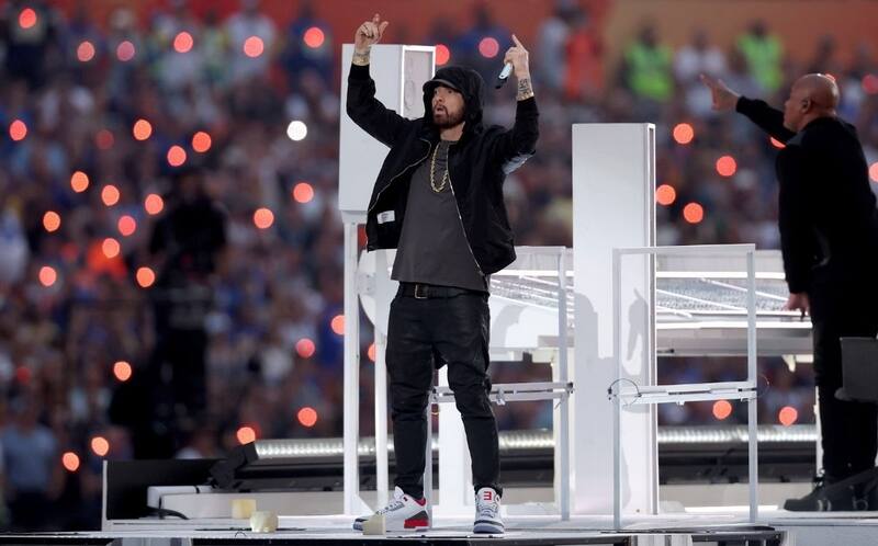 Eminem sorprendió en el show de medio tiempo junto a Dr. Dre, Snoop Dog, Kendrick Lamar, Mary J. Blige y 50 Cent, el cual hizo bailar a todo el SoFi Stadium en Los Angeles, incluyendo a los seguidores de la NFL, así como a las celebridades asistentes, como Jennifer Lopez y Ben Affleck.
