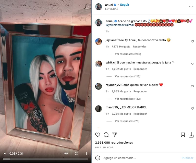 Para acompañar el reel, en el que además la pareja aparece besándose, el puertorriqueño escribió: "Acabe de grabar esto". Entre algunos comentarios de los seguidores de Anuel AA, algunos apuntaron: "Ay Anuel, te desconozco tanto", "Es mejor Karol", entre otros, tomando en cuenta que en pleno 14 de febrero fue cumpleaños de la colombiana.