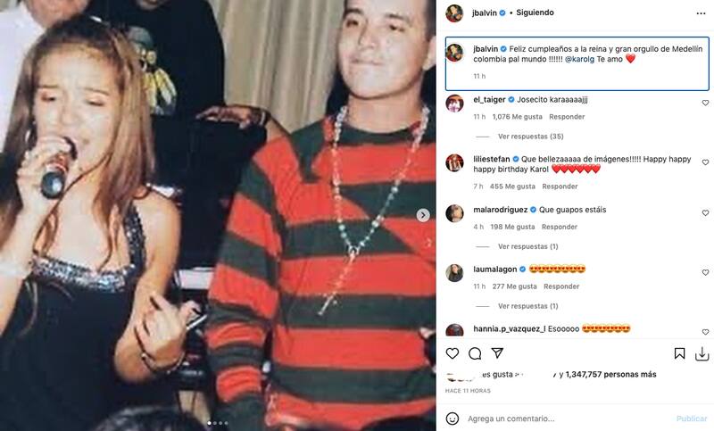 Para acompañar las fotografías del recuerdo, y también recientes, J Balvin escribió en la descripción: "Feliz cumpleaños a la reina y gran orgullo de Medellín colombia pal mundo !!!!!! @karolg Te amo".