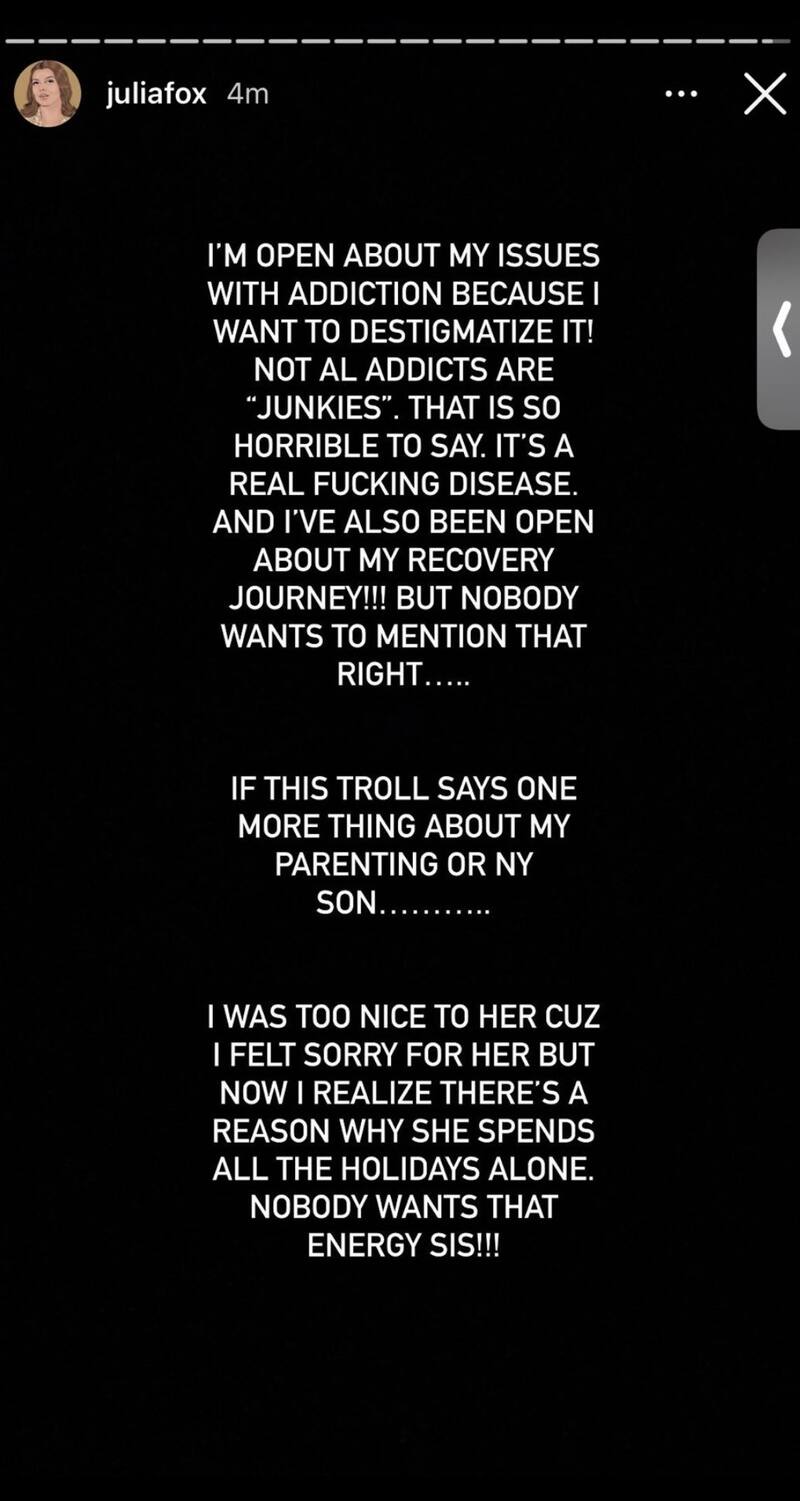 Julia utilizó también para responderle a la cantante: "Estoy abierta a mis problemas con la adicción porque quiero desestigmatizarla! No todos los adictos son 'drogadictos'. Es horrible decir eso. Es una jodida enfermedad de verdad. Y también he hablado abiertamente de mi proceso de recuperación".