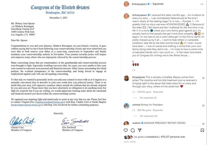 "Queremos invitarla personalmente a usted y a su abogado a reunirse con nosotros en el Congreso en un momento mutuamente conveniente para describir con sus propias palabras cómo lograron la justicia", se puede leer en parte del documento oficial que publicó "La princesa del pop".