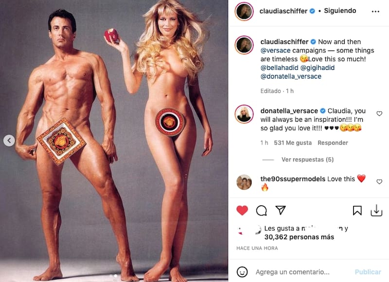 Al tanto, la supermodelo escribió: "De vez en cuando campañas de @versace: algunas cosas son atemporales ¡Me encanta esto!". A lo que Donatella Versace respondió: "Claudia, siempre serás una inspiración!!! ¡¡¡Me alegro mucho de que te encante!!!".