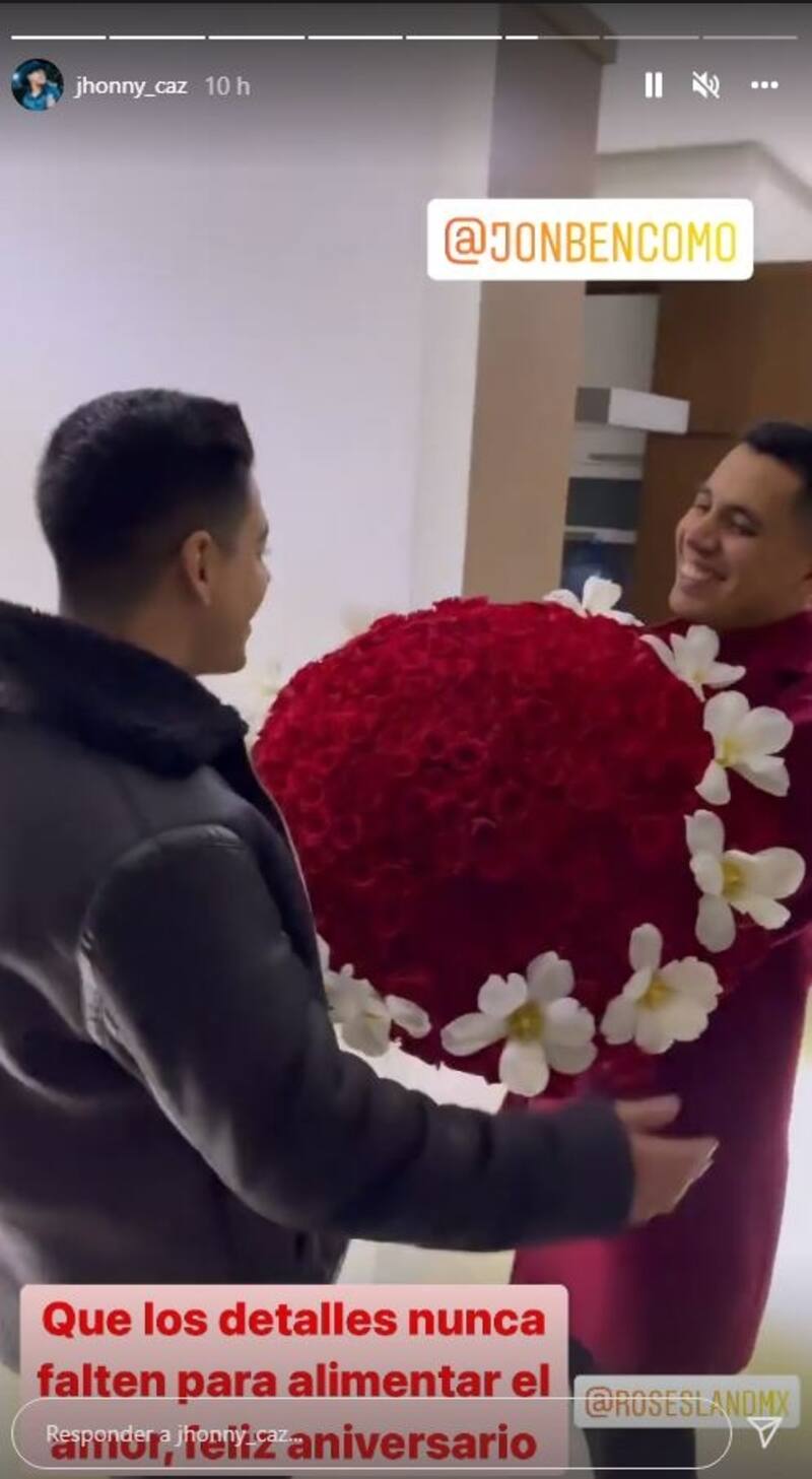 Además a través de sus historias de Instagram, Jhonny Caz compartió un video musicalizado con el tema "El mundo a tus pies" de Grupo Firme, en el que se puede ver el momento en el que llega a casa con un enorme arreglo de flores, dejando sin palabras a Bencomo, "Que los detalles nunca falten para alimentar nuestro amor, feliz aniversario", escribió.