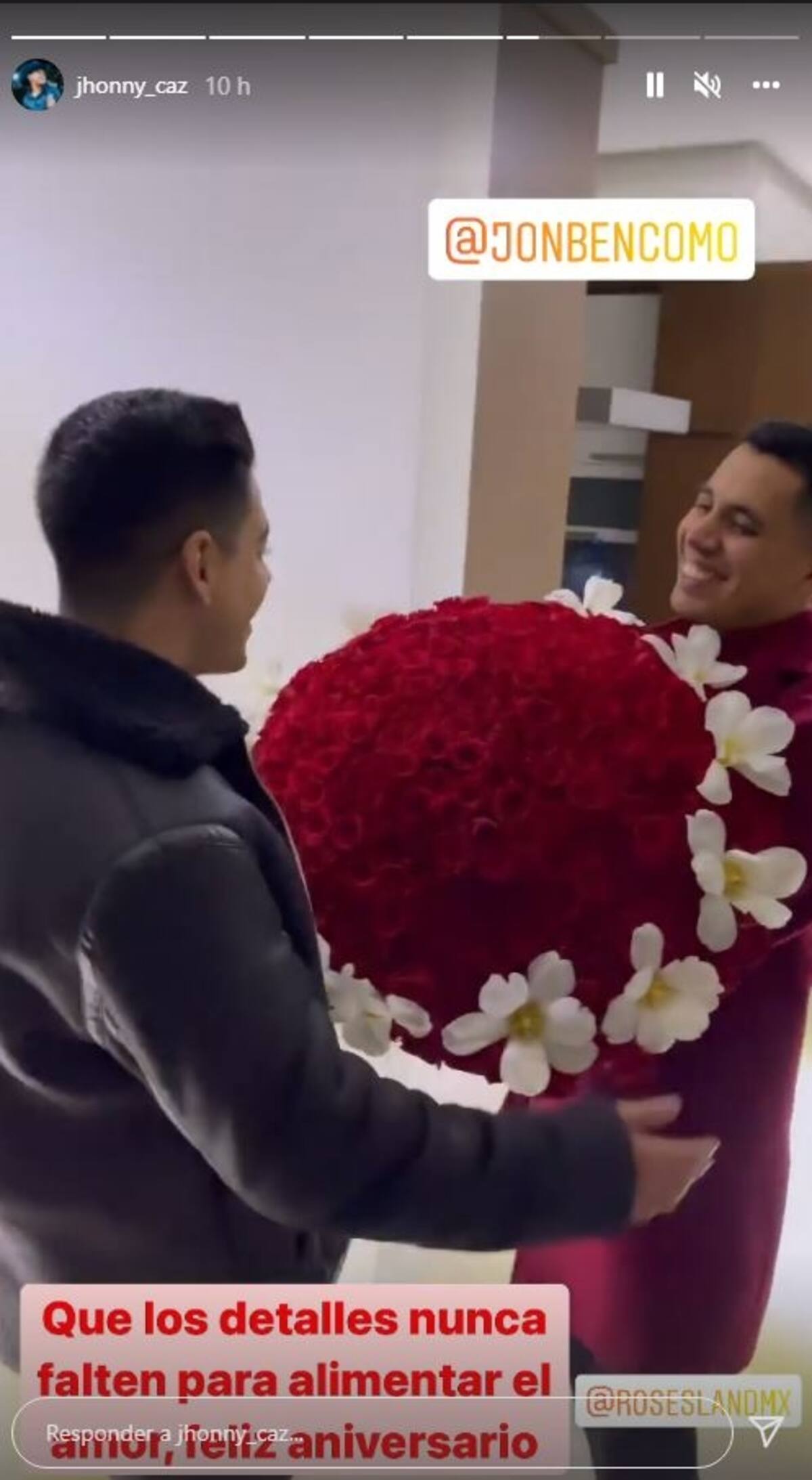 Además a través de sus historias de Instagram, Jhonny Caz compartió un video musicalizado con el tema "El mundo a tus pies" de Grupo Firme, en el que se puede ver el momento en el que llega a casa con un enorme arreglo de flores, dejando sin palabras a Bencomo, "Que los detalles nunca falten para alimentar nuestro amor, feliz aniversario", escribió.