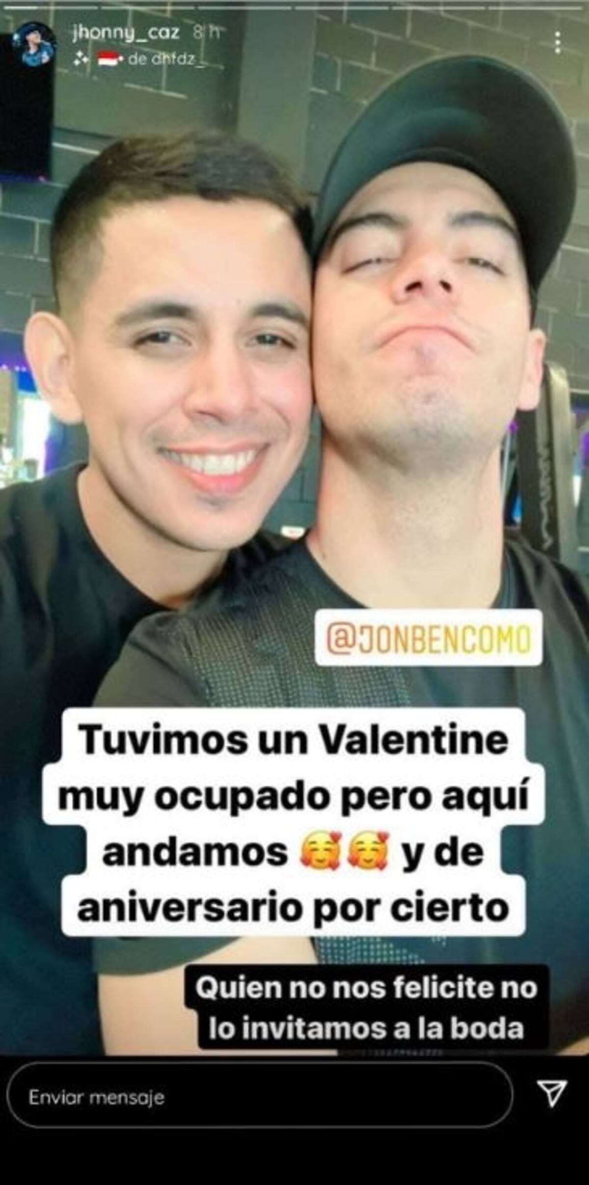 "Hoy podemos decir "EL AMOR SÚPERO LA DISTANCIA" Feliz aniversario @jonbencomo gracias por ser la ley de mi vida", escribió el hermano de Jhonny Caz al pie de una divertida sesión de fotos.