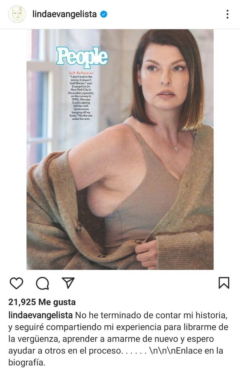 En la entrevista, Linda Evangelista habló sobre el tratamiento al que se sometió, que "congela" la grasa del cuerpo para perder volumen y mejorar la textura de la piel, en varias sesiones entre agosto de 2015 y febrero de 2016.