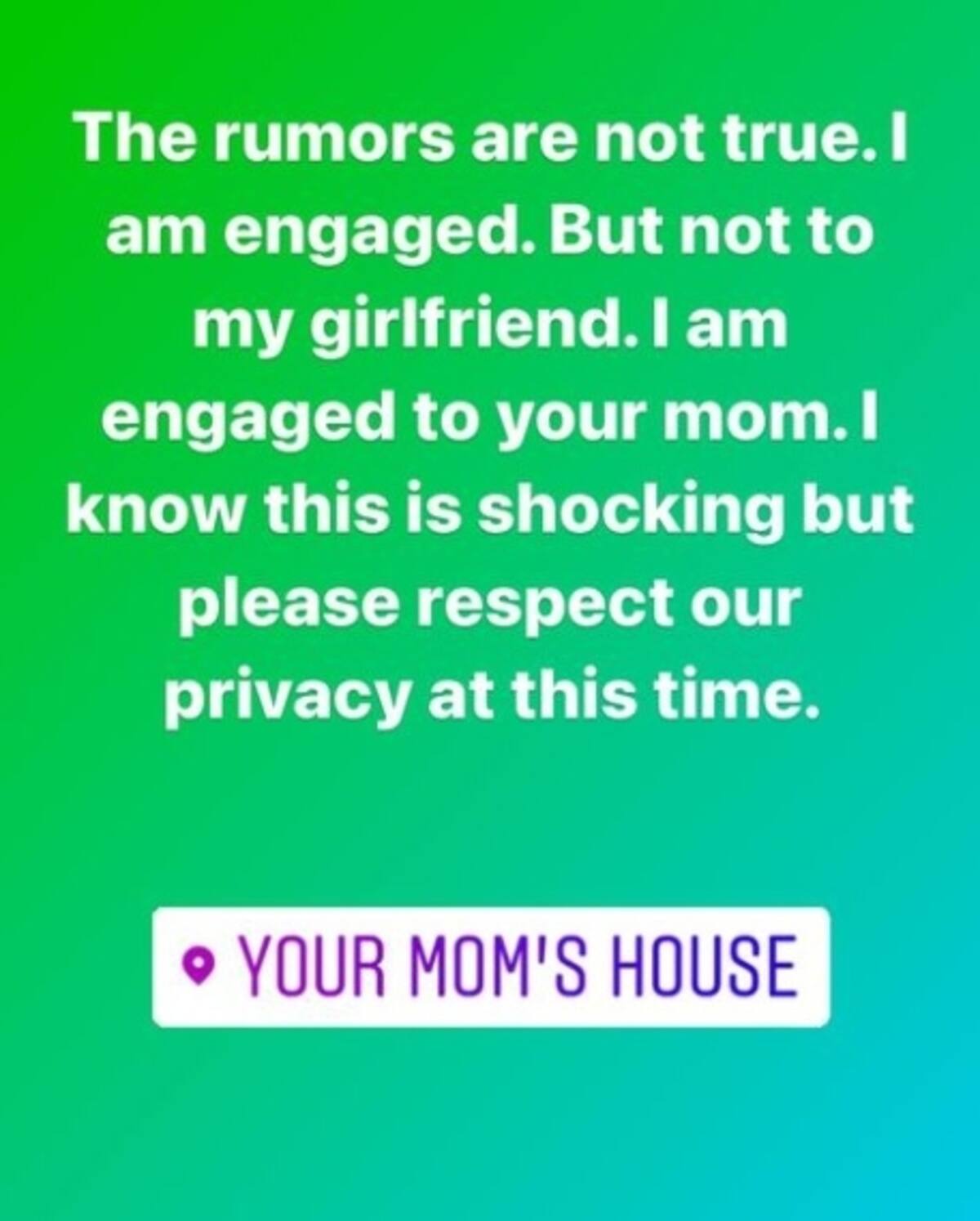 En su cuenta de Instagram confirmó que estaba comprometido, pero no con novia. "Los rumores no son ciertos. Estoy comprometido. Pero no con mi novia. Estoy comprometido con tu madre", se puede leer en su declaración. Luego agregó: "Sé que esto es impactante, pero respete nuestra privacidad en este momento". Todo acompañado con un pedido a los medios de no inventar fake news.