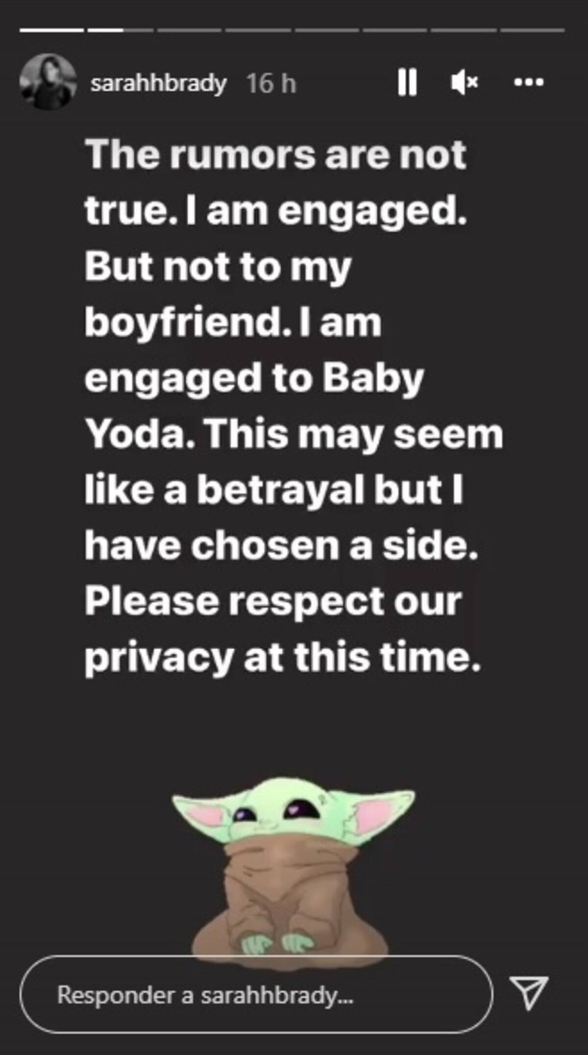 Siguiendo los pasos del ganador del Oscar, Sarah Brady también desmintió el tema, asegurando que ella se había comprometido con Baby Yoda.