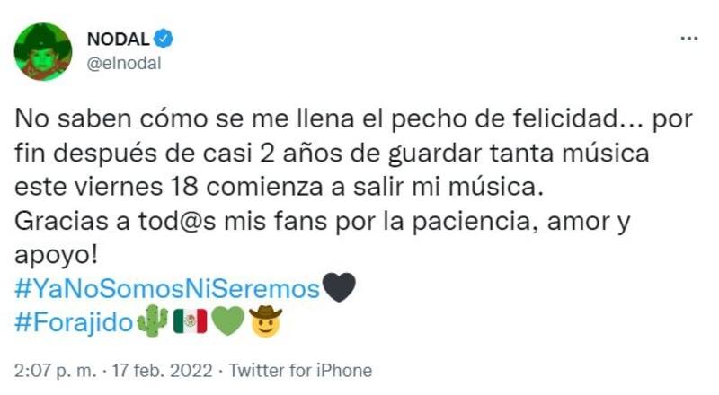 Christian Nodal, en medio de la polémica tras anunciar su ruptura con Belinda -después de casi dos años de relación-, sorprendió este jueves a sus fanáticos anunciando que en los próximos días podrán escuchar su nueva música, parte de su disco "Forajido".