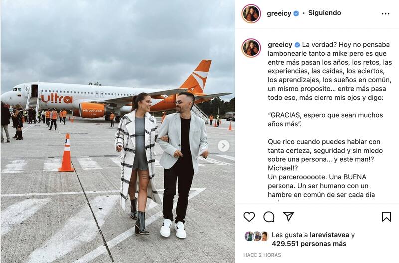 Recientemente, Greeicy publicó una imagen con su pareja en el que se les ve saliendo de un avión, ella tomada de gancho con Mike Bahía y sonriendo, una fotografía con el siguiente mensaje: "¿La verdad? Hoy no pensaba lambonearle tanto a Mike pero es que entre más pasan los años, los retos, las experiencias, las caídas, los aciertos, los aprendizajes, los sueños en común, un mismo propósito… entre más pasa todo eso, más cierro mis ojos y digo: 'Gracias, espero que sean muchos años más'".