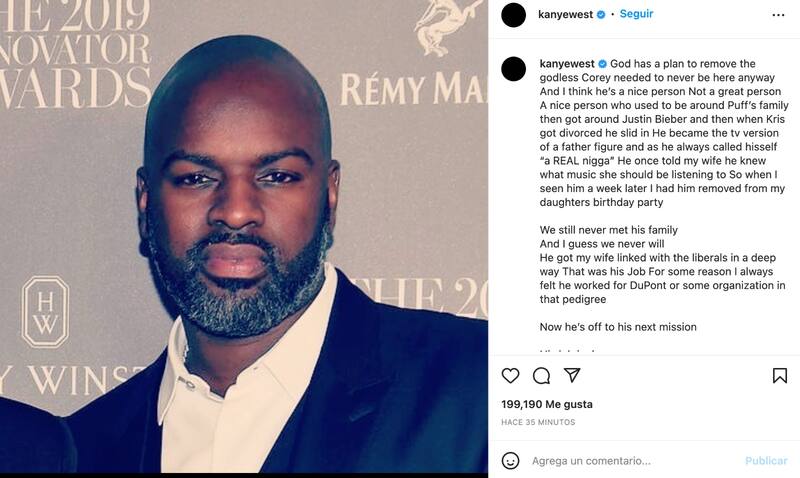 "Dios tiene un plan para quitar al hombre sin Dios Corey. Nunca debió de estar aquí de todas maneras. Y creo que es una persona linda. No es una buena persona, una persona linda que solía estar alrededor de la familia de Puff y después alrededor de Justin Bieber y cuando Kris se divorció se metió como si nada y se convirtió en la versión televisiva de una figura de padre mientras decía que era un "verdadero negro". Una vez le dijo a mi esposa que él sabía qué música debería de escuchar, así que una semana después cuando lo vimos en la fiesta de mi hija hice que lo sacaran. Nunca conocimos a su familia y supongo que nunca la conoceremos. Hizo que mi esposa se conectara con los liberales en una forma muy profunda. Ese fue su trabajo y por alguna razón siempre creí que trabaja para DuPont o alguna otra organización de ese pedigree. Ahora se ha ido a una nueva misión. Su trabajo está hecho. Es a propósito. Yo amo a Kris, esta mujer es una heroína y ha hecho lo que hace por proteger a su familia…", escribió.