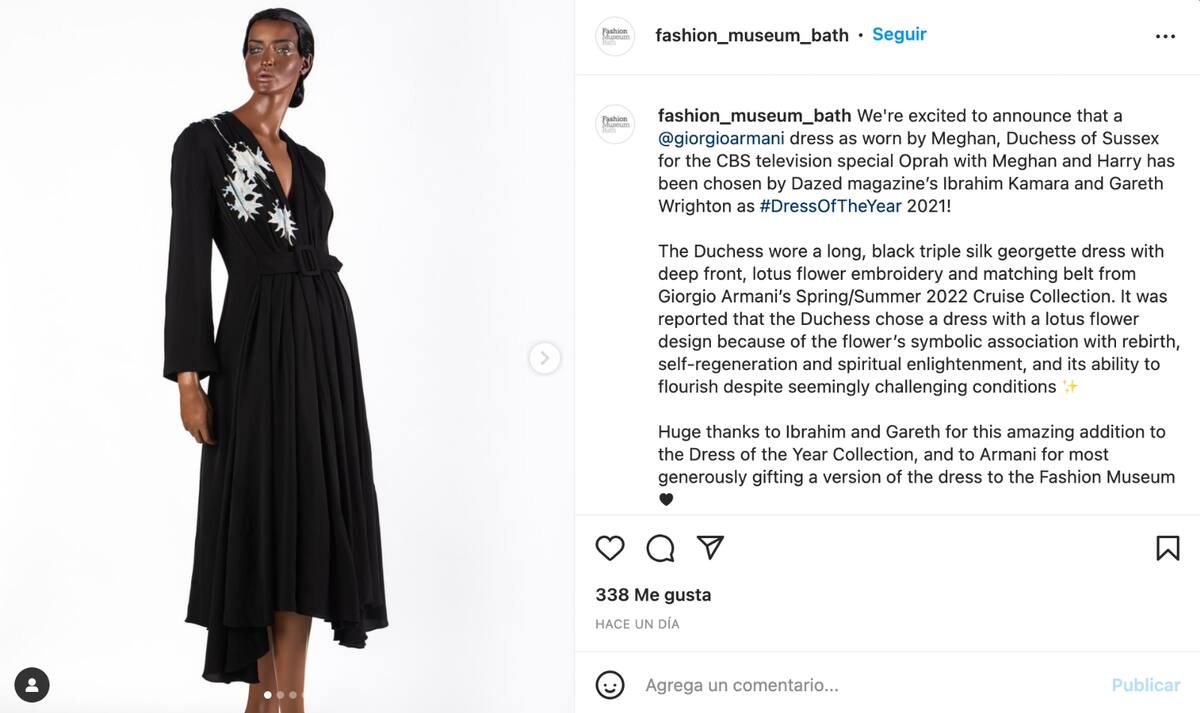 El famoso vestido es nada más y nada menos que de una pieza de Giorgio Armani en color negro con un estampado floral al hombro y un cinto que resaltó la figura de la exactriz. Dicho atuendo está valuado en 4,700 dólares y se exhibirá en el museo inglés bajo la exposición “A History of Fashion in 100 Objects”.