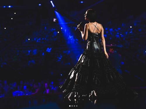 Después, Ángela Aguilar, quien lució un espectacular vestido negro, inició el popurrí con el tema "El Tapatío"; le siguió Eduin Caz y Grupo Firme con el tema "La migra".