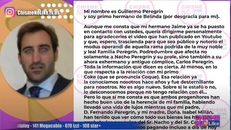 En el programa "Chisme No Like", Elisa Beristain y Javier Ceriani compartieron una carta que les envió Guillermo Peregrín, primo hermano de Belinda, en la que hace fuertes revelaciones sobre la "rama podrida" de la familia de la famosa cantante.