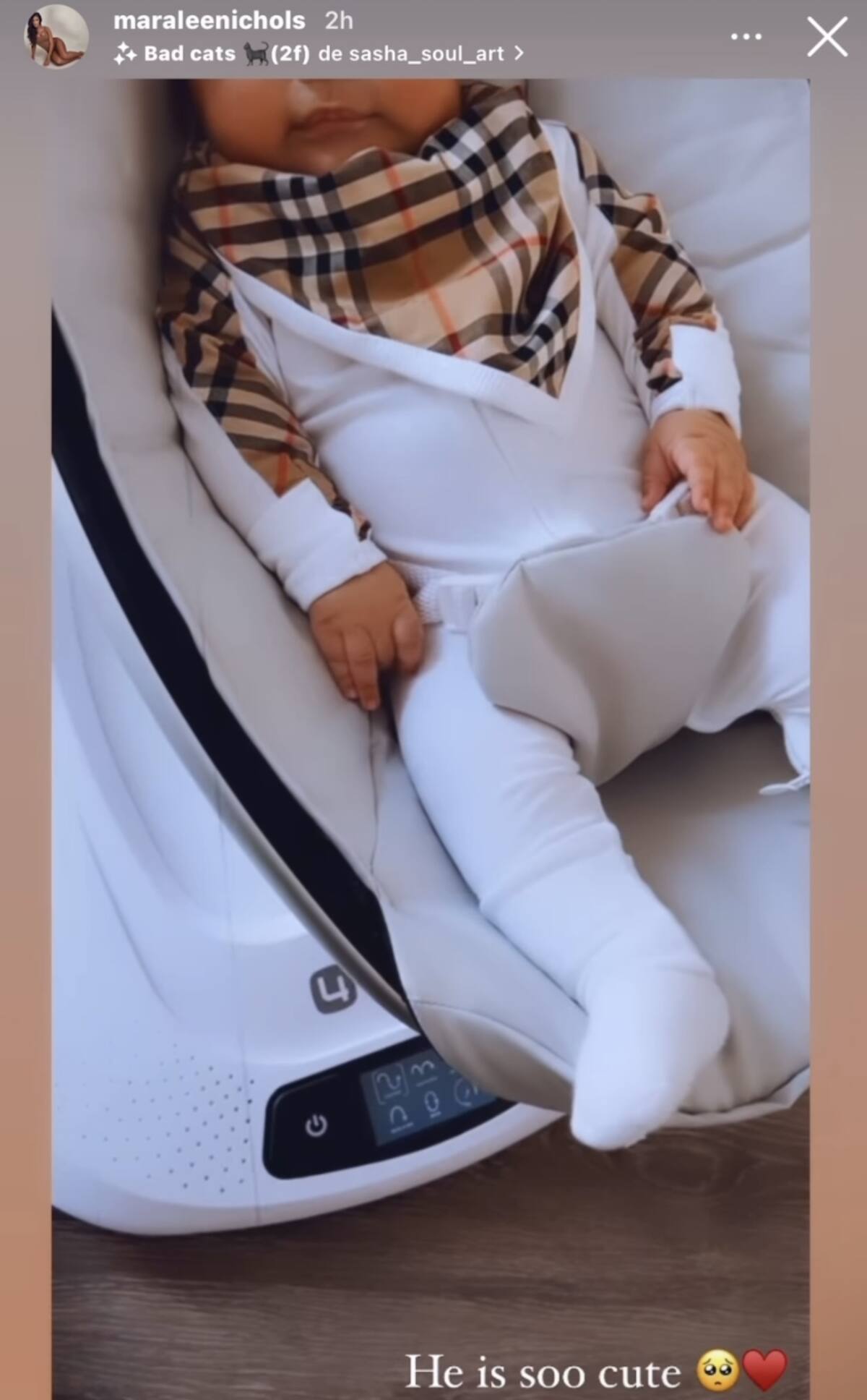 A través de historias de Instagram Maralee Nichols compartió un video en el que se le ve acostado al pequeño de casi tres meses de edad vistiendo un trajecito Burberry. “Es tan lindo”, escribió la entrenadora personal en su publicación.