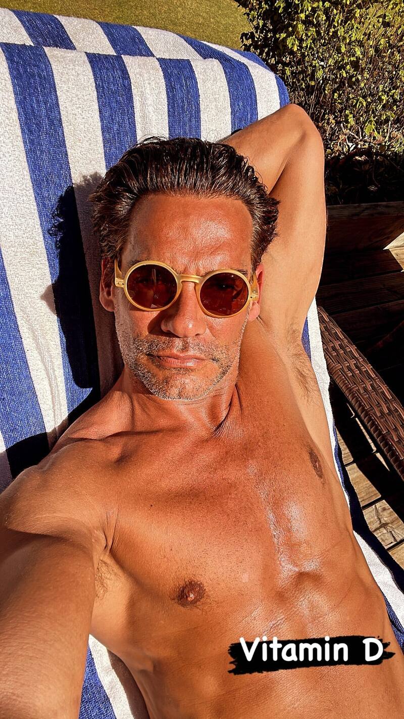 El actor ha compartido a través de sus redes sociales sus vacaciones al lado de su familia y su mascota "Buda". En una de sus historias subió una foto de él tomando sol con la frase "Vitamina D", donde se aprecia su tonificado torso.